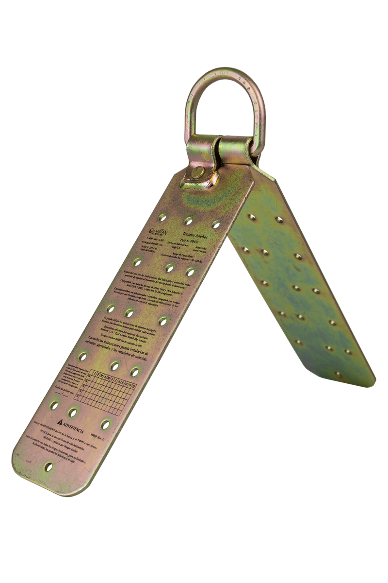 The Guardian Fall Protection Temper Reusable Anchor is a reusable anchorage connector designed for temporary use on wood rooftops. It can fit all roof pitches from flat to 12/12, is composed of thick plated steel for longer lasting product life, and is ideal for Fall Arrest and Restraint applications. This anchorage connector can be installed with either screws or nails (depending on roof pitch), and its designed offset holes down the center help keep the truss from splitting. Supplied with all necessary fasteners (always use new fasteners for each new installation application).