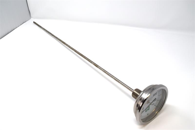 24 inch stem thermometer. 1/2" Male Threads. 3 inch Dial. 150 degrees F to 750 degrees F.