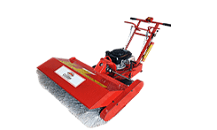 Convenient three position control for brush angles that are spring loaded with gates for positive positioning of brush; straight to right to left. Equipped with a handle mounted ignition switch, a 6 HP Honda gasoline engine and is self-propelled. Right angle gear drive eliminates serpentine belt drive and need for tension adjustments of belts.
