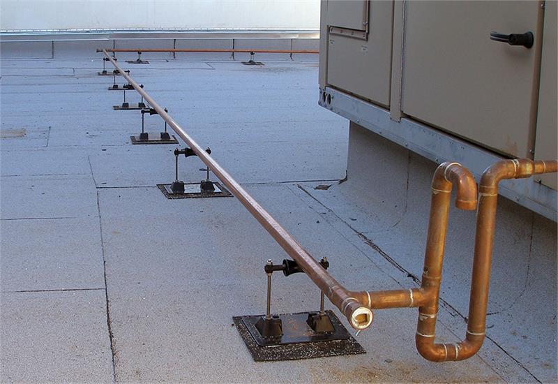A “roller-bearing” pipe support used to support roof-mounted gas pipes, electrical conduit, solar piping and other mechanical piping. Unique design absorbs thermal expansion and contraction of pipes thus preventing damage to the roof membrane. Pipes rest on a self-lubricating polycarbonate resin roller rod and roller. The pipe support base is made of polycarbonate resin, the supporting all-thread and all metal parts are made of stainless steel. Pipestand will accommodate up to 3″ pipe (inside diameter) or up to 3 3/4″ (outside diameter) pipes.
