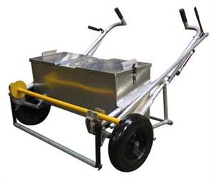 All aluminum construction for light weight. Includes control to apply a brake to one wheel while lifting the lower paper roller for easy threading of paper. Adjustable valve to be able to vary the amount of hot delivered to the deck. Asphalt valve at the rear so that the operator can watch for voids to eliminate potential leaks. Lids seal with silicone gasket to help reduce spilled asphalt.