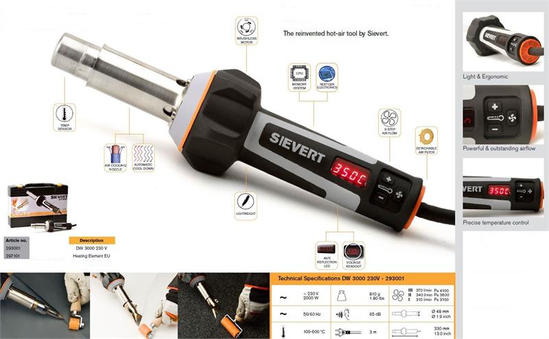 The most advanced yet user-friendly product ever made by Sievert. The revolutionary DW 3000 represents the modern day hot-air tool. The innovative and modern design of the DW 3000 is breaking the classic boundaries of the hot-air tool market, making it the lightest and most ergonomic in its class yet the most powerful. The power, precision, and control of the DW 3000 comes from a brushless motor powered by next-gen electronics. The next-gen electronics provide the DW 3000 its unique features and also make it possible to precisely control the power and heat of the tool.