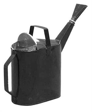 Designed for convenient, narrow strip pouring (vertical or horizontal). Removable and adjustable spout is 4" wide, with basket screen, safety splash hoods, comfortable full length pouring handle, flush skid bottom and oval shape.
