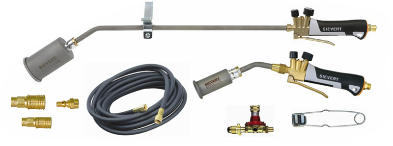 32” Titanium Torch Assembly, 225-375K BTUs 15”Titanium Torch assembly, 50-88K BTUs 25ft hose, Quick connect for handle (2) POL Regulator, Quick connect for hose Striker
