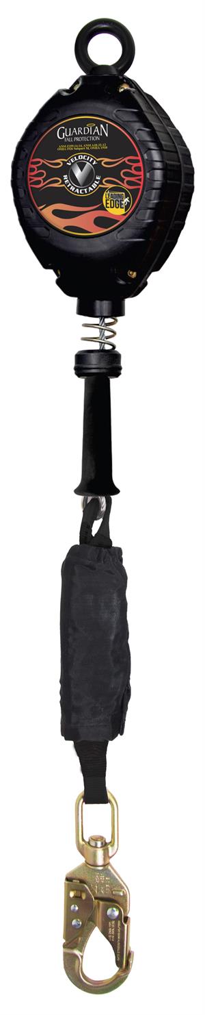 The Guardian Fall Protection Velocity SRL-LE is designed specifically for LE work. It includes an integrated shock absorbing component that helps refocus forces away from the portion of the cable that comes into contact with the edge. While the ideal position for any attachment point is overhead, LE retractables play an important role in the construction industry because, frequently, the only viable attachment point is at foot level.